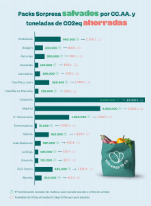 A nivel nacional, la comunidad de usuarios de Too Good To Go, junto a los más de 16.000 establecimientos que se han sumado a la iniciativa, han conseguido salvar más de 12 millones de packs. Con ello, se ha evitado el desperdicio de más de 12.000 toneladas de comida y más de 22.500 toneladas de C02eq en toda España hasta la fecha.