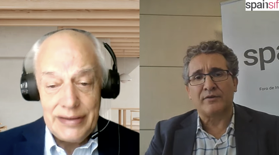 En la imagen: Joaquín Garralda, presidente (izda.), y Pablo Esteban, experto en finanzas sostenibles de Spainsif, durante el encuentro.